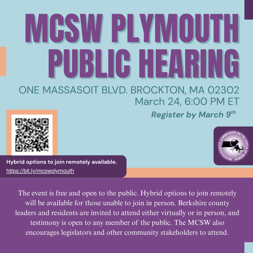 Join the Massachusetts Commission on the Status of Women (MCSW) and the Plymouth County Commission on the Status of Women (PCCSW) for an upcoming hybrid public hearing focusing on issues affecting women and girls in the Commonwealth – this time at the Brockton Campus of Massasoit Community College!